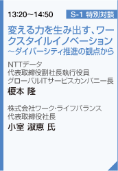 本講演では、ワークスタイル変革の第一人者である、株式会社ワーク・ライフバランス 代表取締役社長の小室淑恵氏をお招きし、課題解決への道筋をご講演いただくとともに、昨今、数々の表彰を受けた当社のワークスタイル変革推進役である、代表取締役副社長の榎本との対談にて、ダイバーシティ推進のポイントを明らかにしていきます。